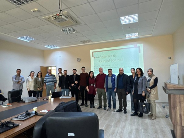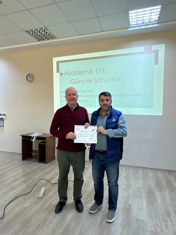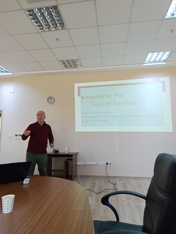 Seminerin konuşmacısı İşletme Bölümü öğretim üyesi Prof. Dr. Fahri Apaydın, “Akademide Etik” başlıklı sunumunda akademik yaşamda etik ilkelerin önemi, bilimsel dürüstlük anlayışı ve akademisyenlerin mesleki sorumlulukları üzerine önemli bilgiler paylaştı.